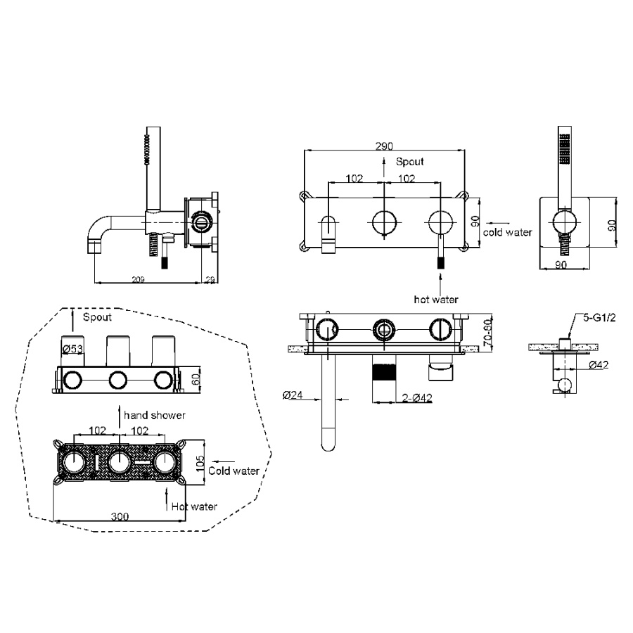 смеситель; монтажная часть; ручной душ; душевой шланг; шланговое подключение; инструкция.