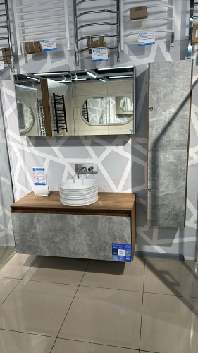 Комплект Корпус тумбы 1200 Дуб + Фасад тумбы Бетон + Фасад зеркального шкафа 120 + Корпус зеркального шкафа Бетон + Корпус пенала 150 Дуб + Фасад Mobi AQWELLA