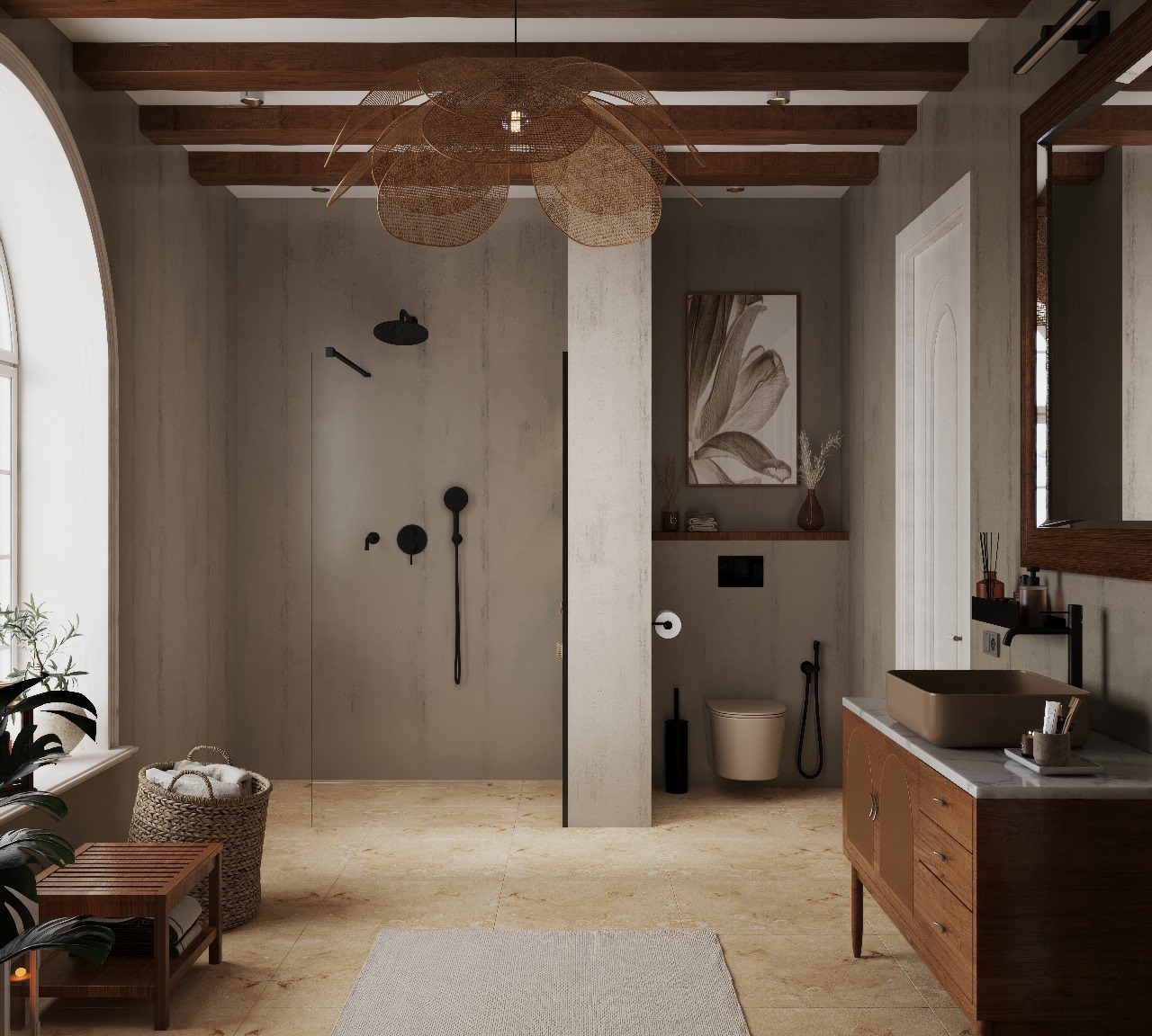 Завершает образ окно в виде арки, пропускающее мягкий дневной свет, и деревянные балки на потолке, добавляющие пространству шарма и ощущение основательности.