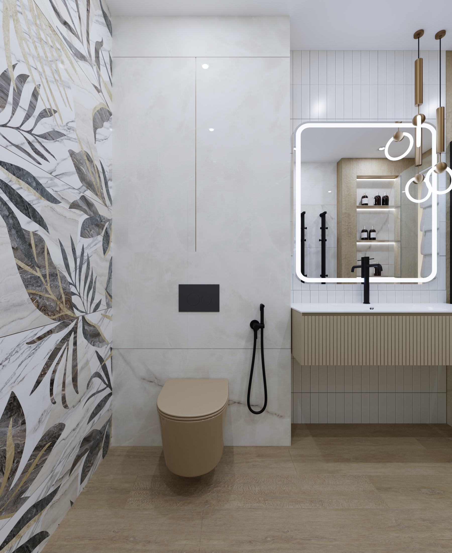 Оформлена в современном стиле для молодой семьи. Основной задачей было создать практичный, легкий и при этом светлый, красивый интерьер, но без значительных затрат. В качестве ключевого акцента выбран унитаз фирмы AVS пастельного оттенка, который эффектно контрастирует с черными деталями: смесителем, кнопкой смыва, душевой лейкой и полотенцесушителем. Для оптимизации пространства спроектирована ниша с полочками сбоку над инсталляцией, обеспечивающая удобное размещение принадлежностей для ванны. Современный выразительный интерьер сочетает в себе продуманную эргономику и утонченную эстетику.